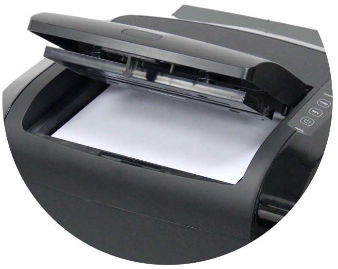 - Компактный – горизонтальный лоток подачи документов не увеличивает высоту уничтожителя и удобнее в использовании, т.к. загрузка документов происходит со стороны пользователя.