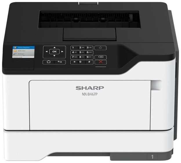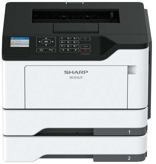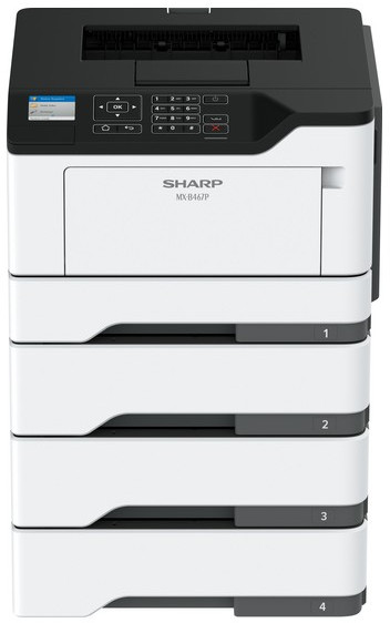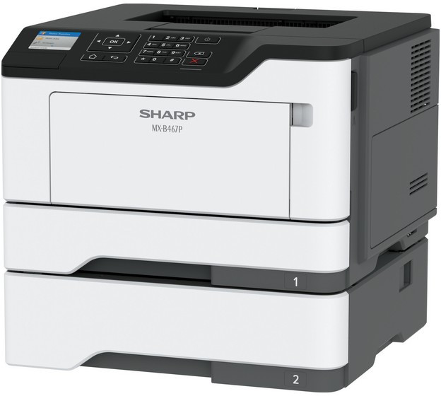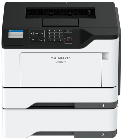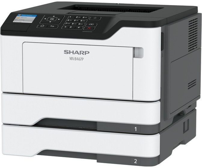 - MX-B467PEU - это компактный монохромный принтер формата A4 начального уровня для небольшого или домашнего офиса, который можно использовать как в настольном, так и напольном исполнении.