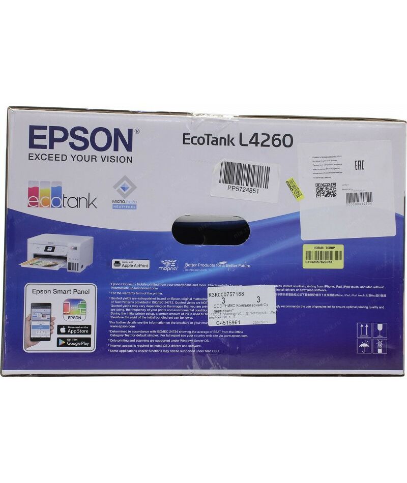 - Технологии беспроводной печати: Apple AirPrint, Epson Email Print (облачная печать), Epson iPrint, Epson Smart Panel, Mopria