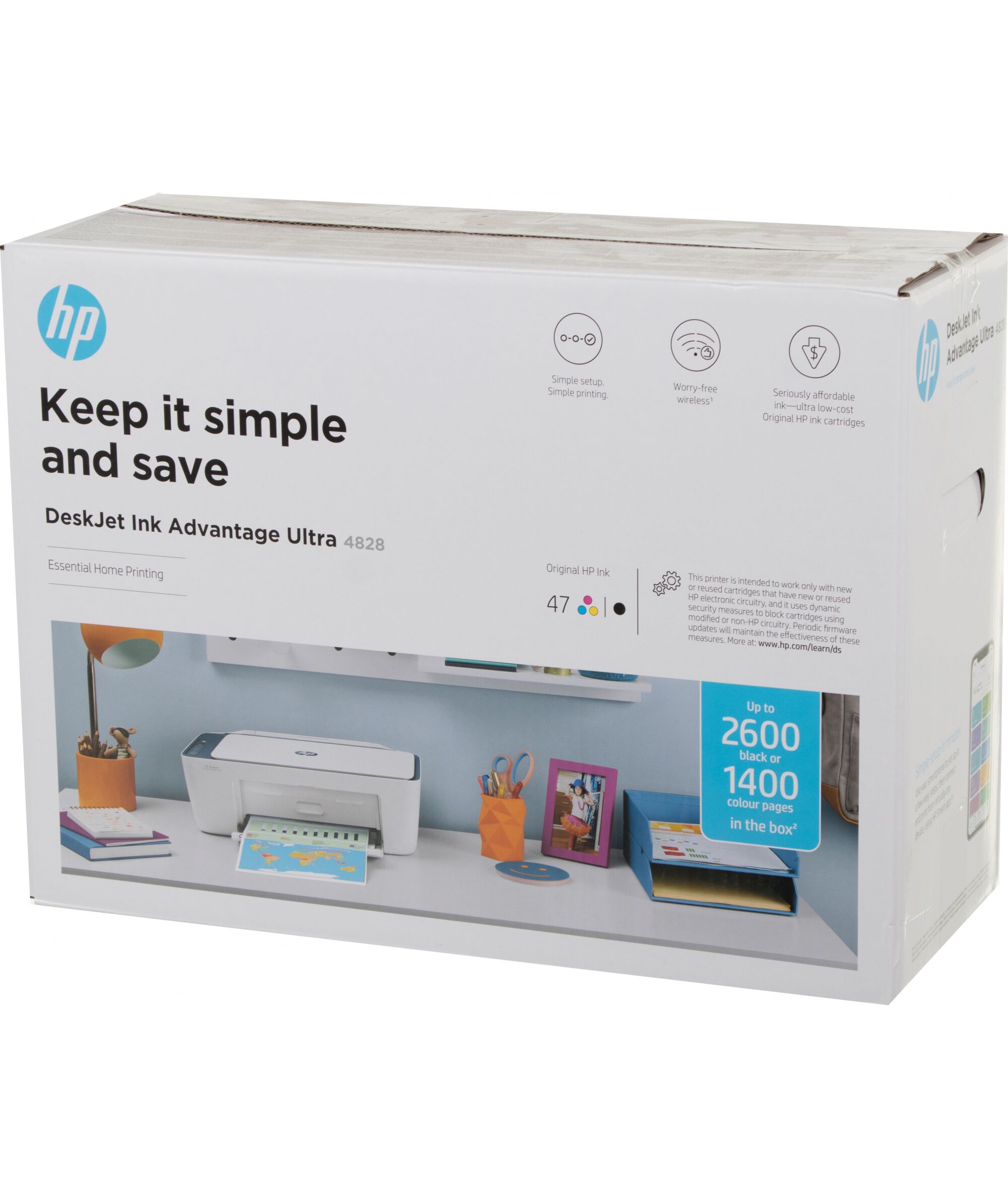 | Комплектация | МФУ HP DeskJet Ink Advantage Ultra 4828, 2 черных картриджа HP 47, 2 трехцветных струйных картриджа HP 47, руководство по установке, справочное руководство, кабель питания. Кабель USB приобретается отдельно. |