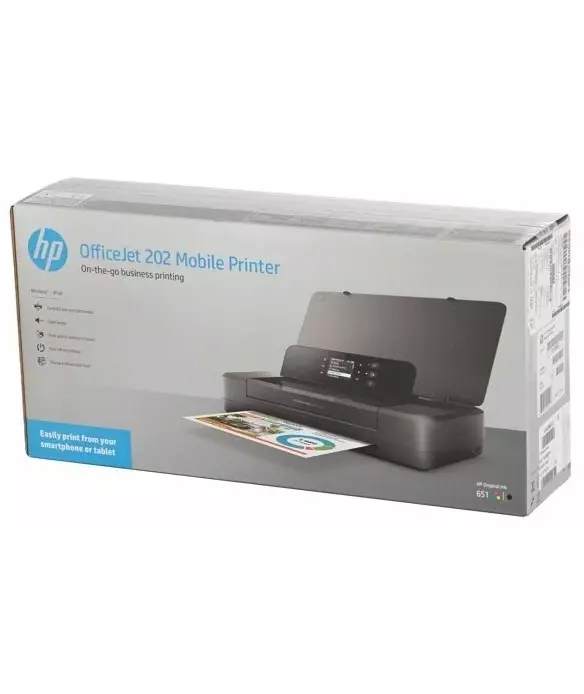 - мобильный принтер HP OfficeJet 202, стартовый струйный картридж Ink Advantage - черный, стартовый струйный картридж Ink Advantage - трехцветный, листовка с нормативными требованиями, инструкция по настройке, кабель питания