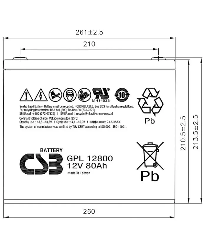 Аккумулятор CSB GPL 12800 общего применения со сроком службы более 10 лет в буферном режиме (Более 12 лет при 20°С по классификации Eurobat) или более 260 циклов заряда-разряда в циклическом режиме при 100% разряде.