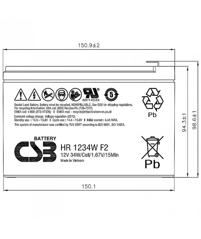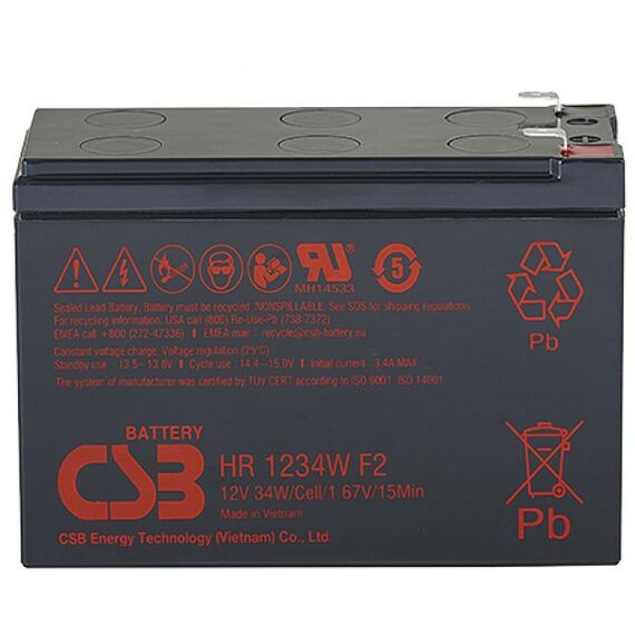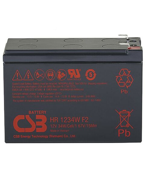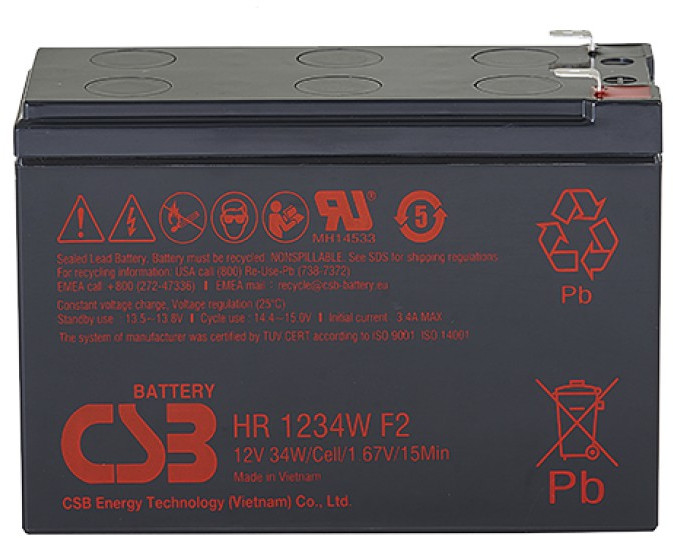 - Аккумулятор CSB HR1234W с высокой энергоемкостью. Особенная кристаллическая решетка электродов позволила увеличить на 20% отдаваемую мощность по сравнению с батареями других серий