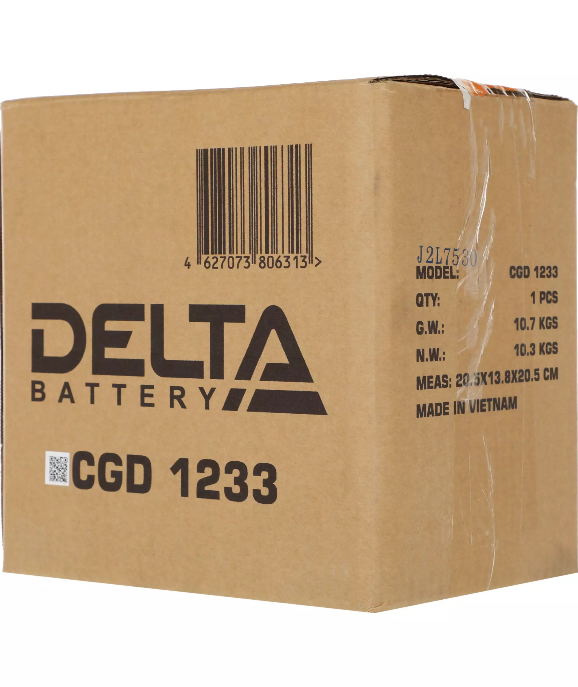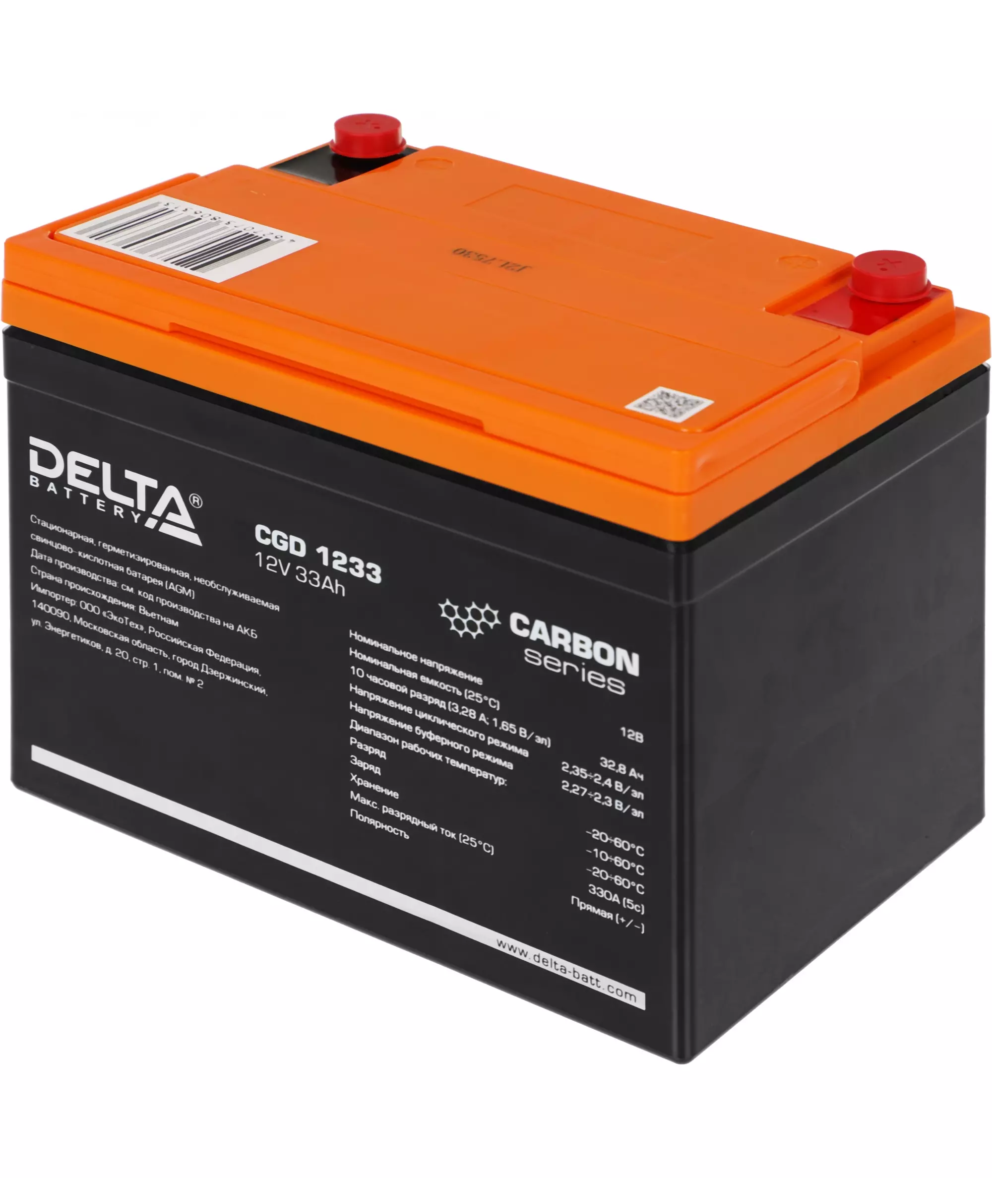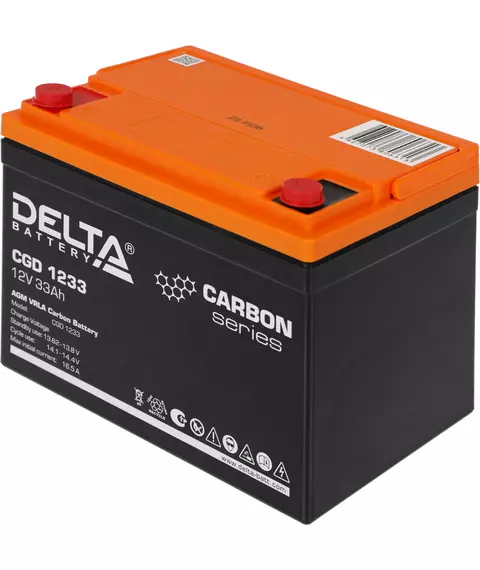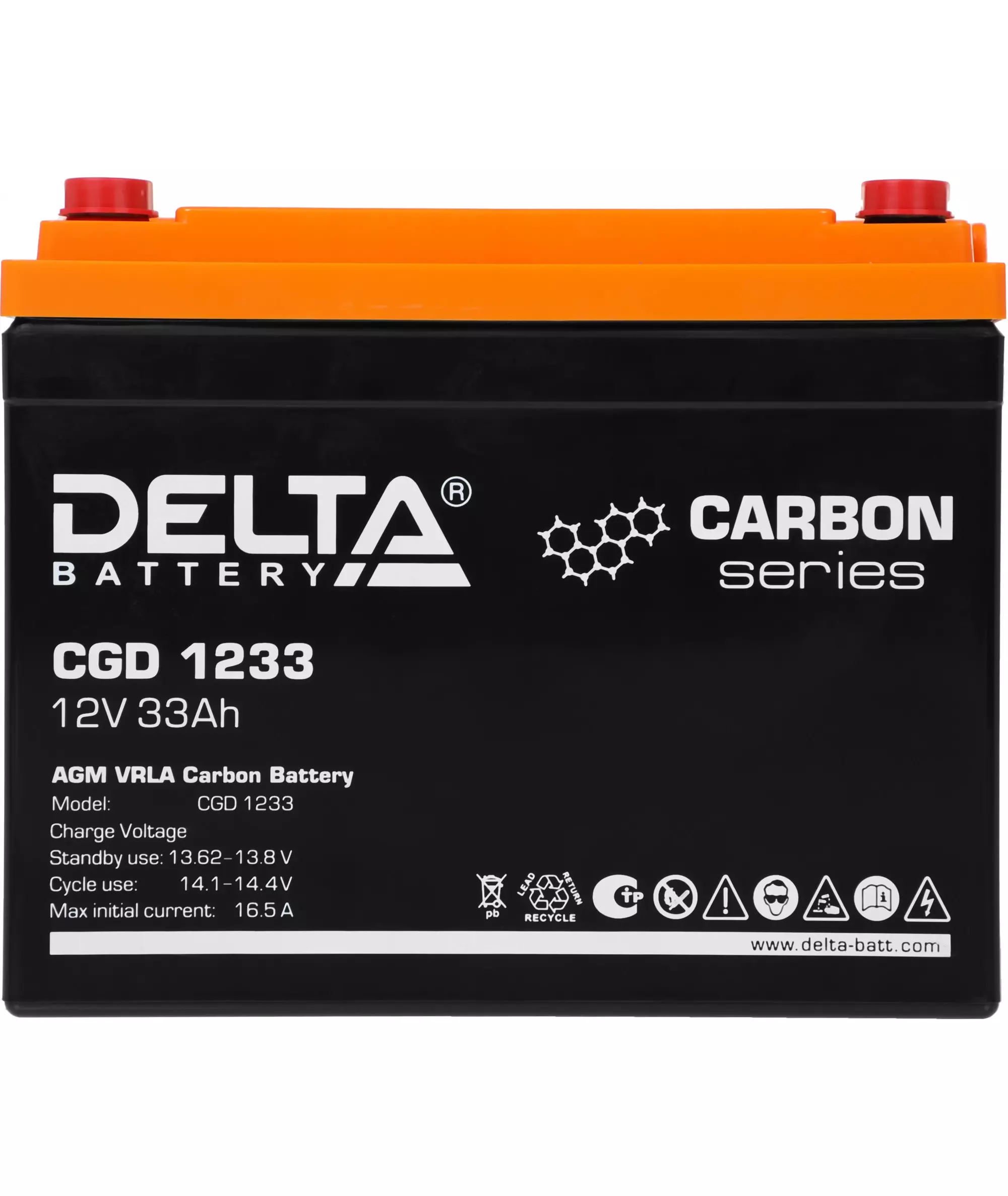 Свинцово-кислотный аккумулятор Delta линейки CGD выпускается с напряжением 12 В и ёмкостью 33 Ач. В основе лежит технология AGM, жидкий электролит удерживается внутри стекловолоконных сепараторов неподвижно.