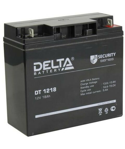 - Герметизированный VRLA cвинцово-кислотный аккумулятор Delta DT 1218 напряжением 12В и емкостью 18Ач изготовлен по технологии AGM (с микропористым заполнителем, пропитанным электролитом)