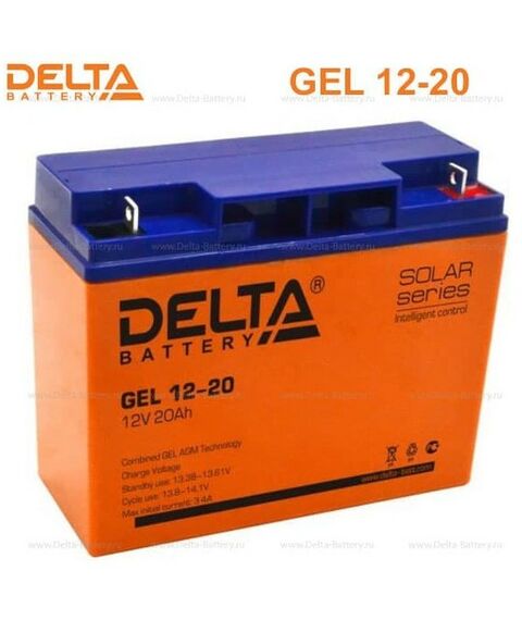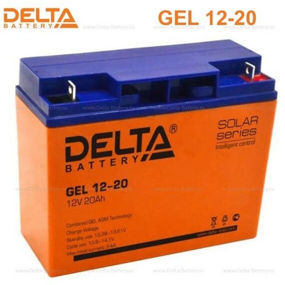 - Свинцово-кислотный аккумулятор Delta GEL 12-20 напряжением 12В и емкостью 20Ач изготовлен по технологии AGM+GEL: combined AGM and GEL technology (частичное сгущение электролита)