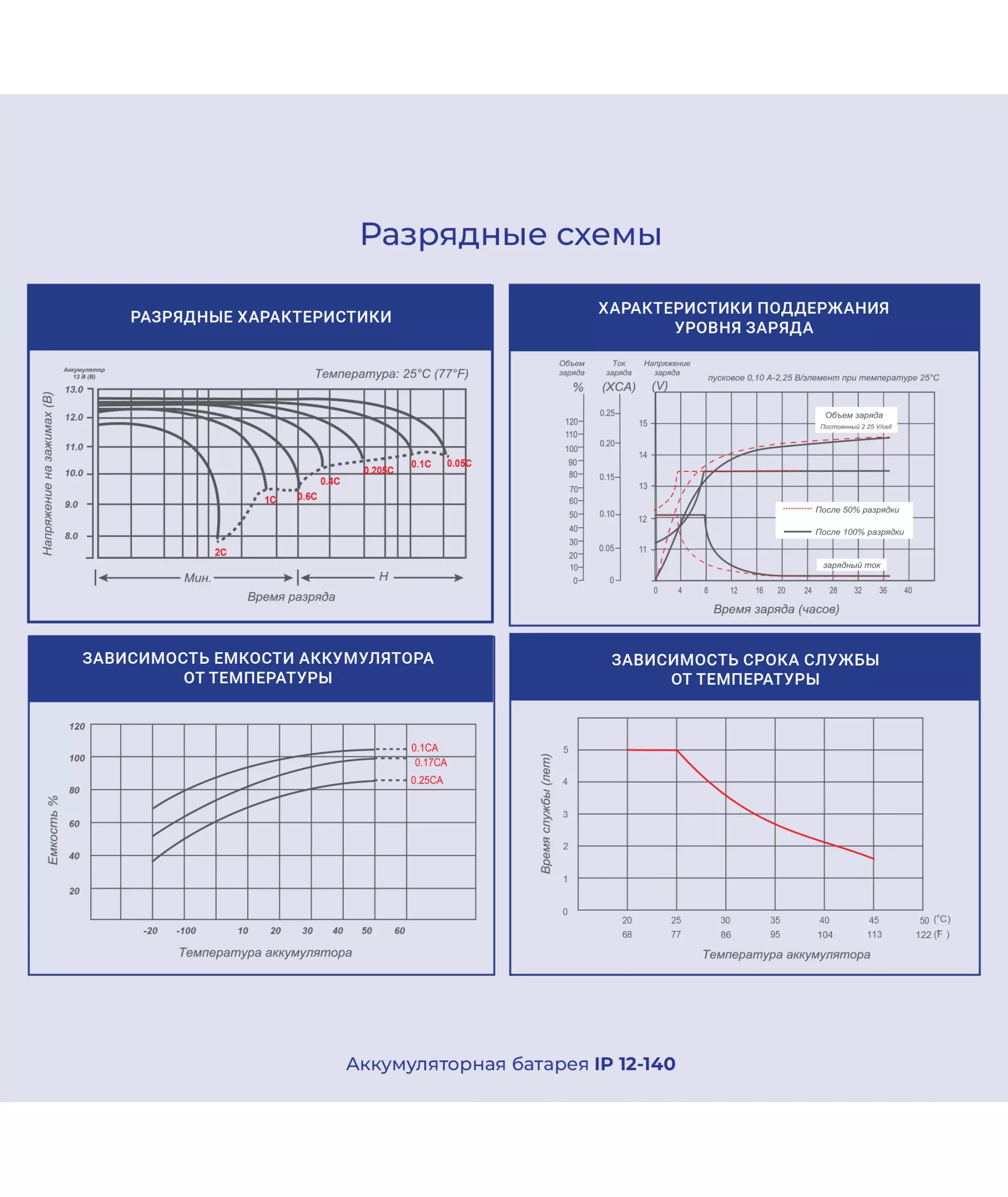 | Циклический режим | Начальный ток заряда менее 2,70 А. Напряжение 14,4 В~15,0 В при 25 C. Температурный коэффициент - 30 мВ/ C |