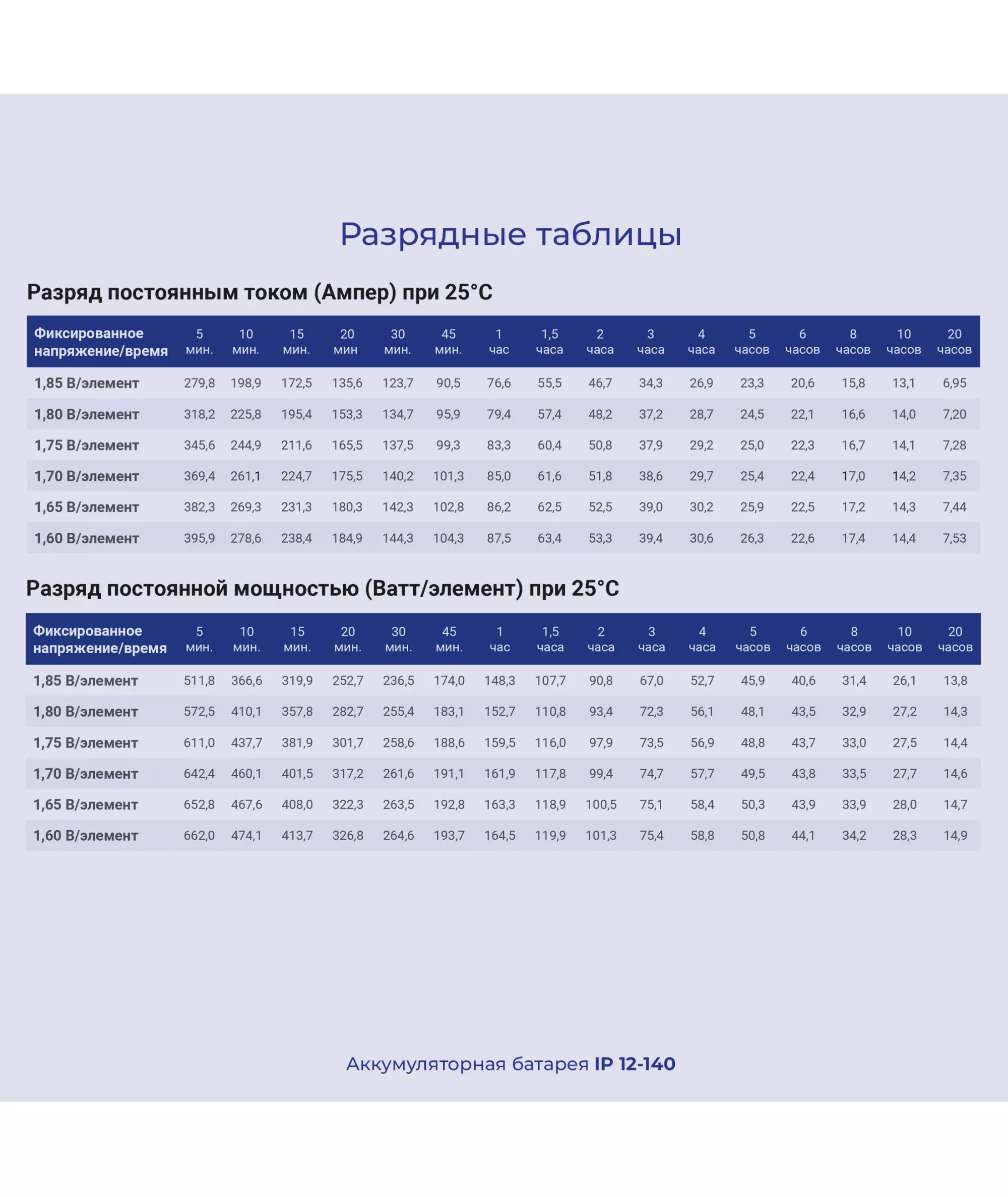 | Саморазрядка | Аккумулятор хранить максимум в течение 6 месяцев при температуре 25 C, после чего необходим подзаряд. При более высоких температурах период времени будет сокращен. |