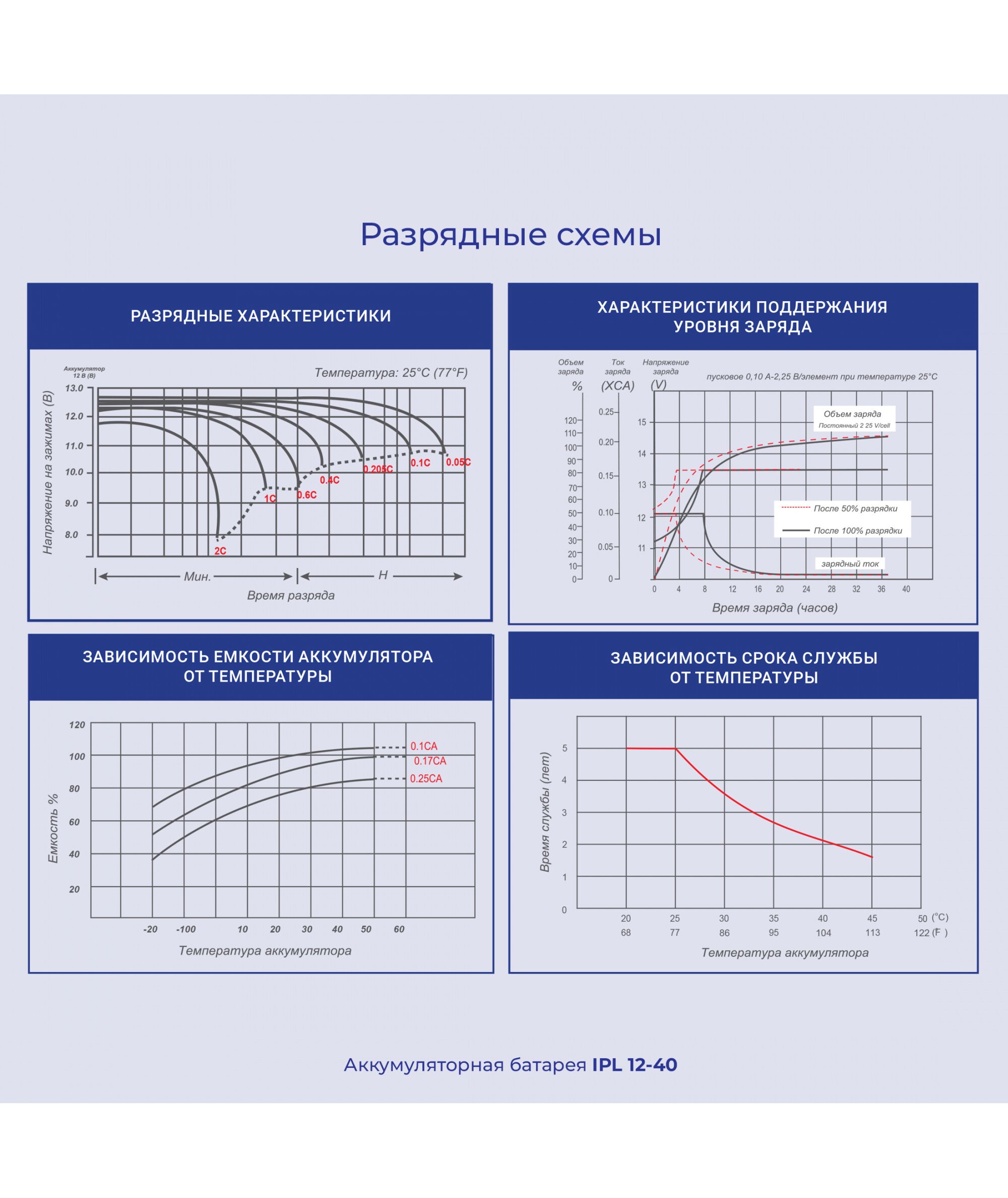 | Влияние температуры на емкость | 40 C 103%, 25 C 100%, 0 C 86% |