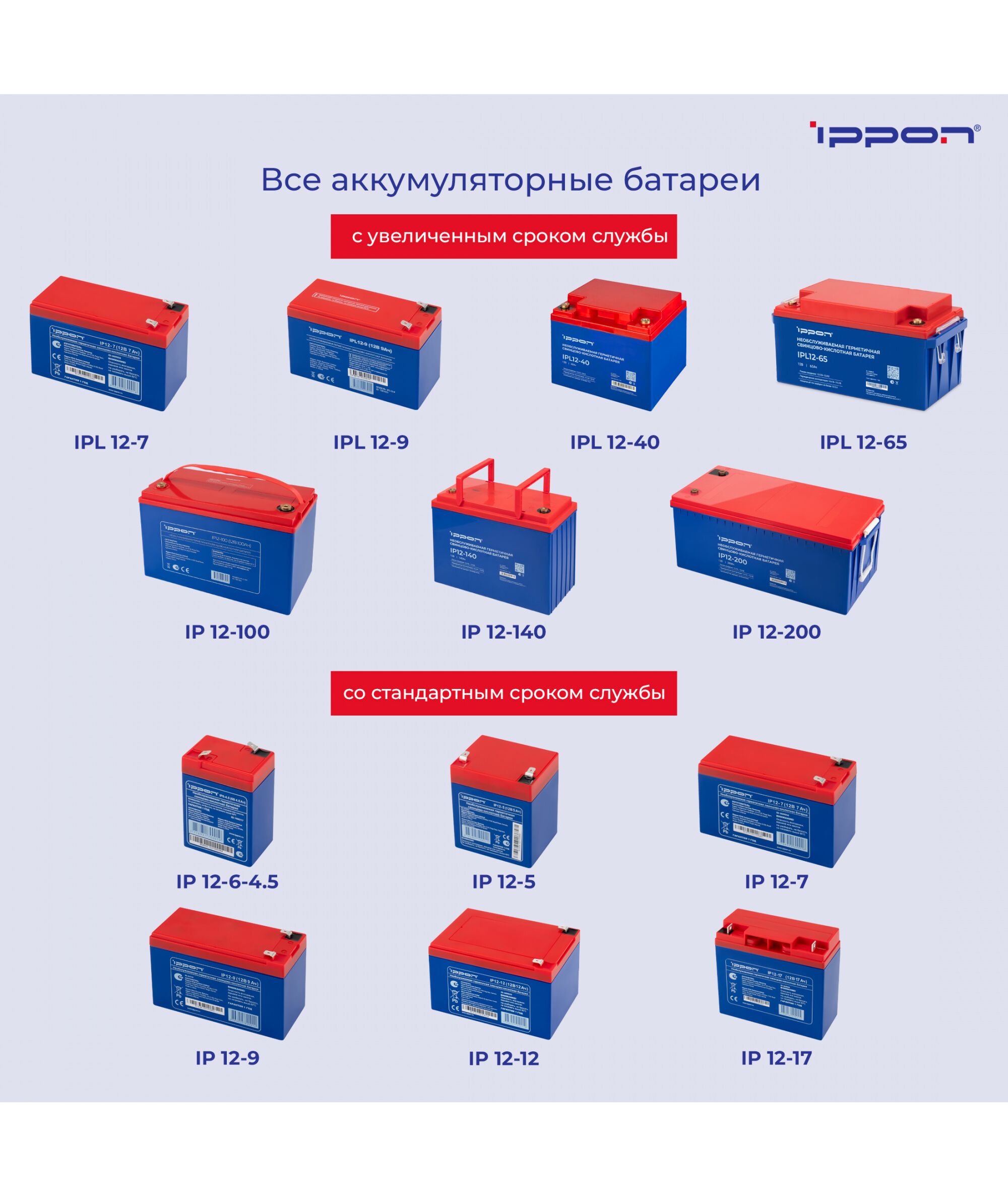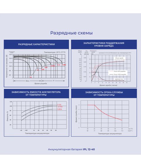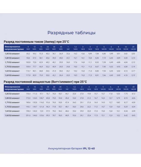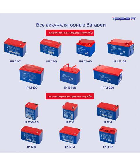 | Саморазрядка | Батареи Ippon разрешается хранить без подзарядки не более 6 месяцев при температуре 25 C. При повышении температуры срок хранения без подзарядки уменьшается |