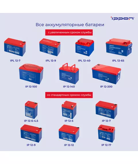 | Саморазрядка | Батареи IPPON разрешается хранить без подзарядки не более 6 месяцев при температуре 25C (77F). При повышении температуры срок хранения без подзарядки уменьшается |