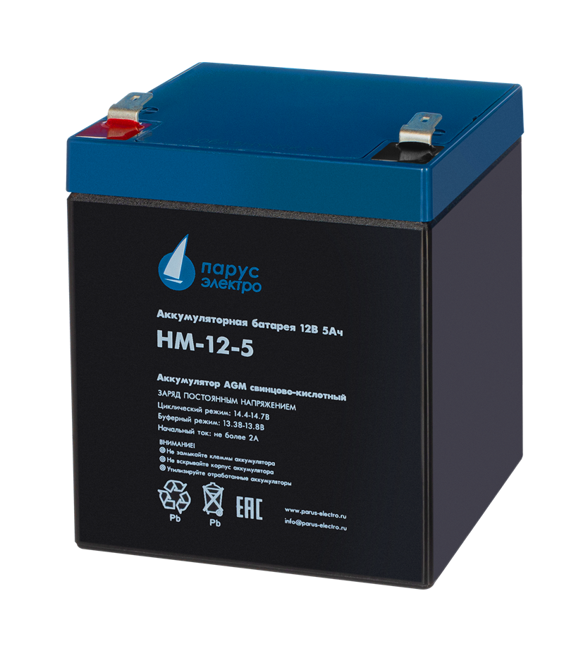 Батарея Парус электро HM-12-5 12В, 5Ач (разряд 20 часов), макс. ток разряда (5сек) 75А, макс. ток заряда 2А, свинцово-кислотная типа AGM, клеммы F2, 90х70х101мм