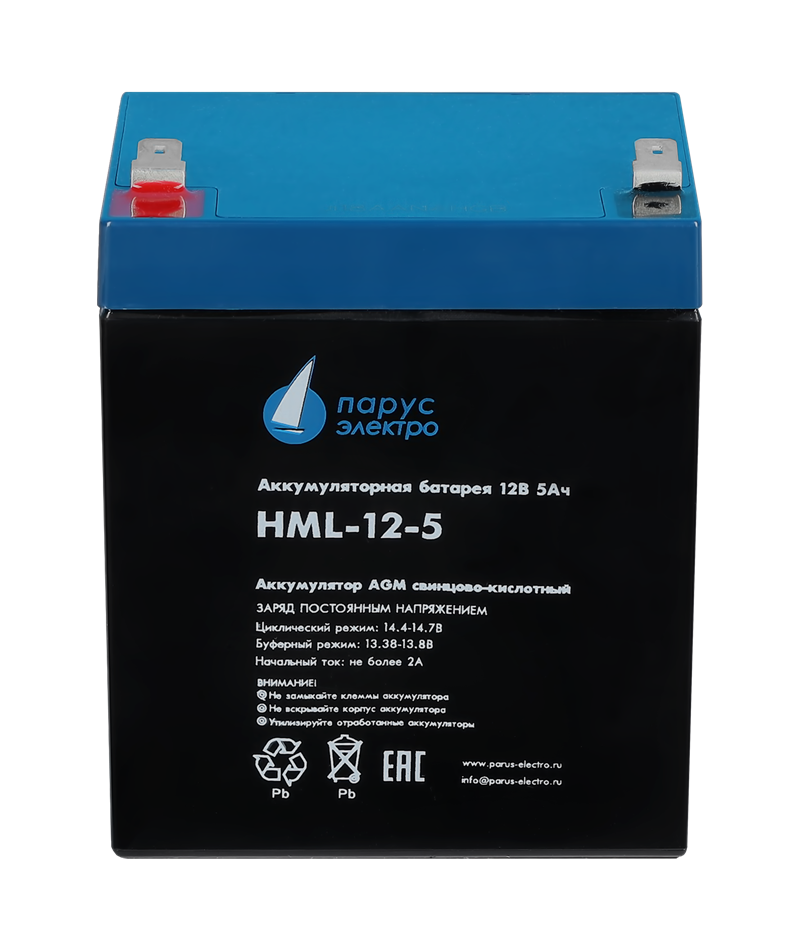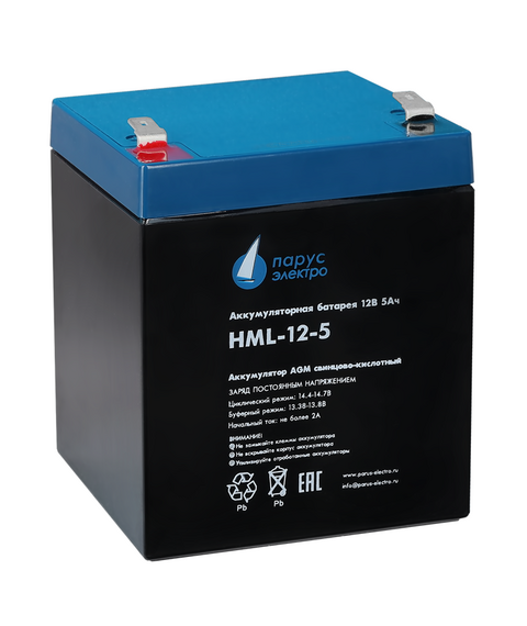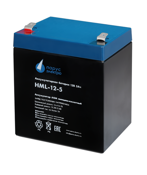 Батарея Парус электро HML-12-5 12В, 5.2Ач (разряд 20 часов), макс. ток разряда (5сек) 75А, макс. ток заряда 2А, свинцово-кислотная типа AGM, клеммы F2, 90х70х101мм