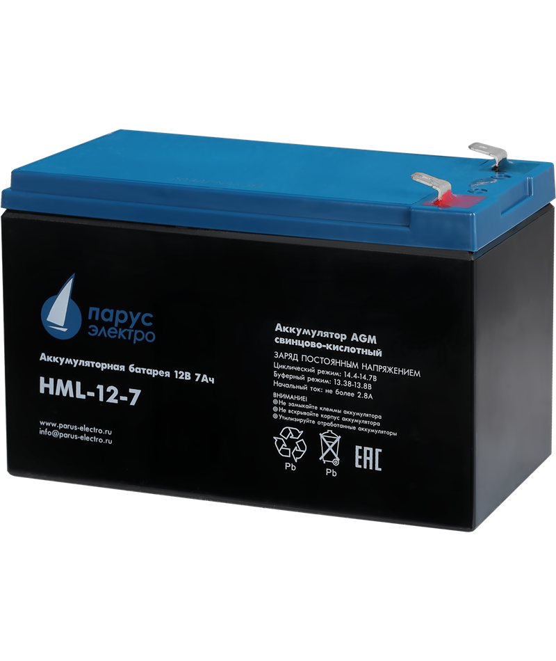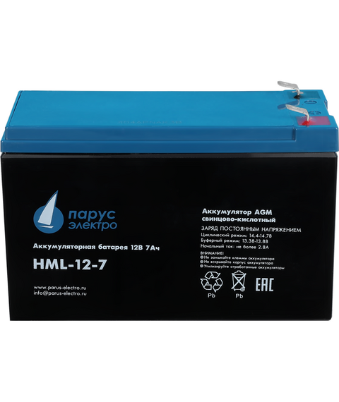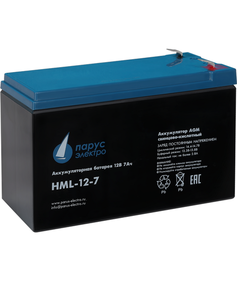 Батарея Парус электро HML-12-7 12В, 7.2Ач (разряд 20 часов), макс. ток разряда (5сек) 140А, макс. ток заряда 2.8А, свинцово-кислотная типа AGM, клеммы F2, 151х65х94мм