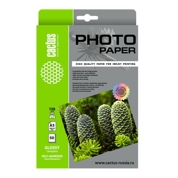 Фотобумага Cactus CS-GSA513050 A5, 130г/м2, 50л, глянцевое, самоклей, для струйной печати