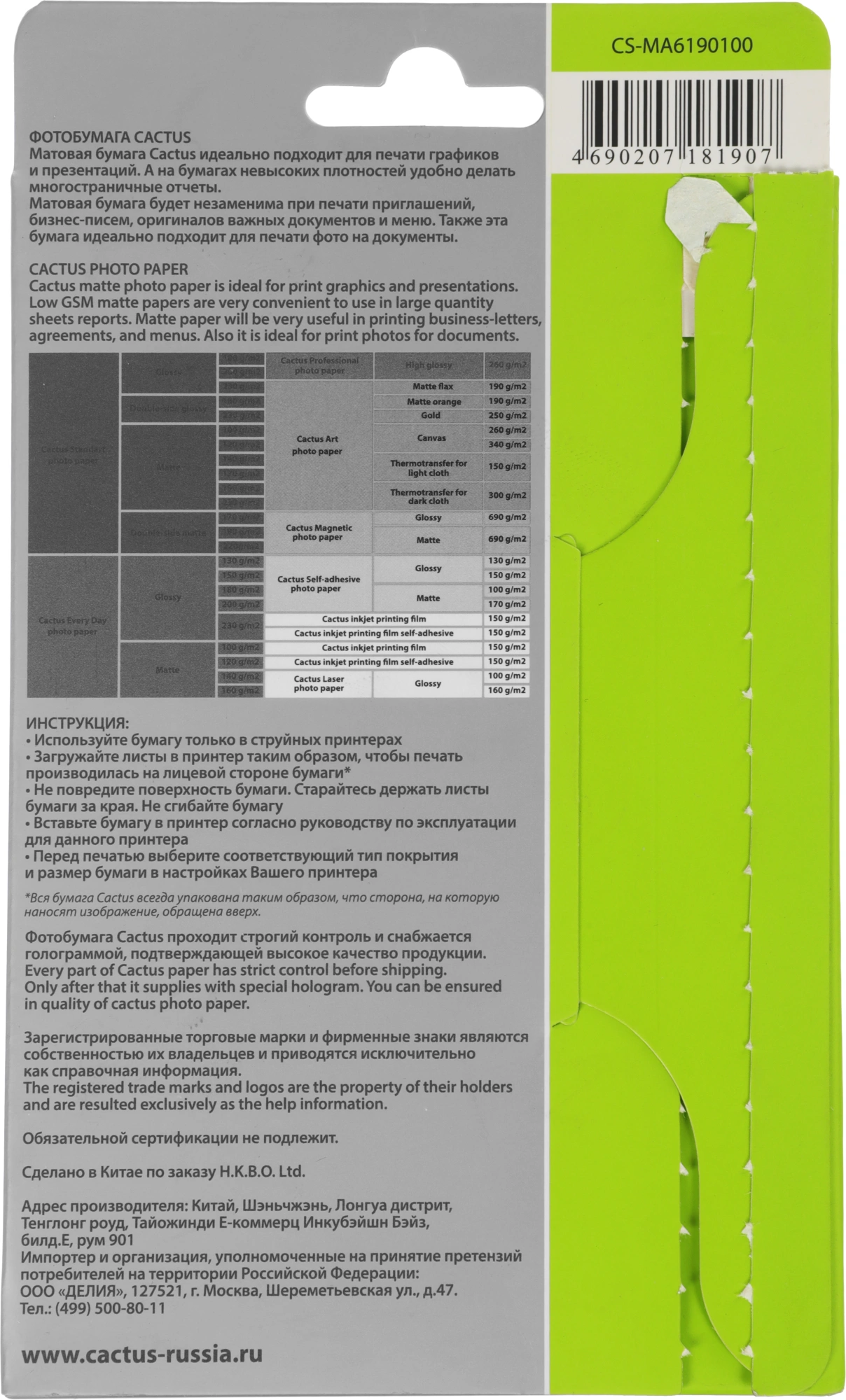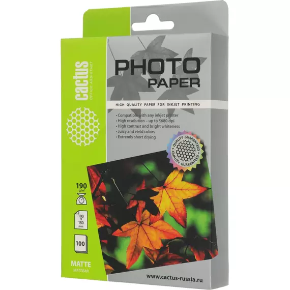 Фотобумага Cactus CS-MA6190100 10x15/190г/м2/белый/100л матовое для струйной печати