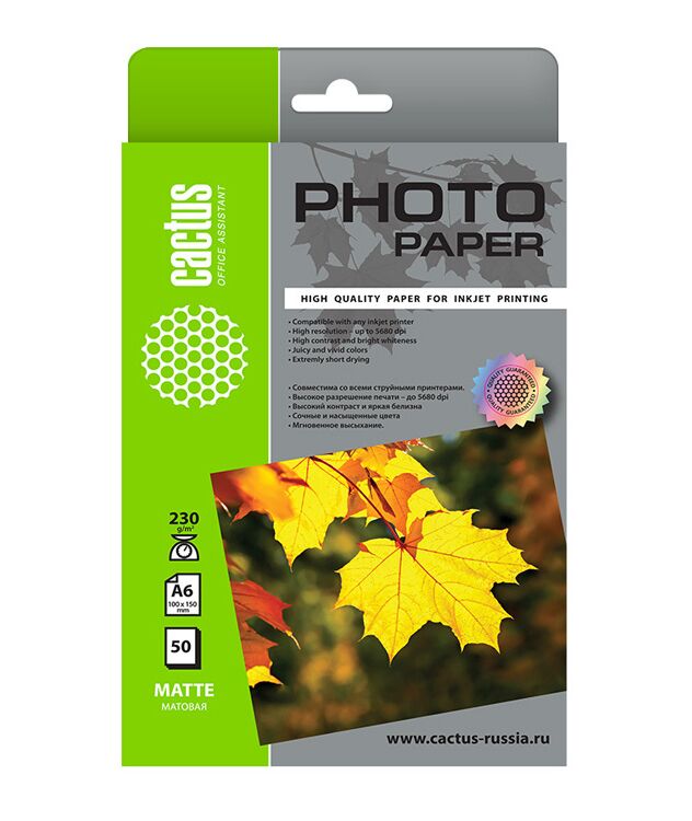 Фотобумага Cactus CS-MA623050 10x15/230г/м2/50л./белый матовое для струйной печати