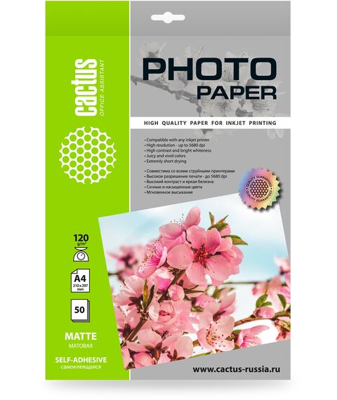 Фотобумага Cactus CS-MSA412050 A4 120г/м2 50л белый матовое самоклеящееся для струйной печати