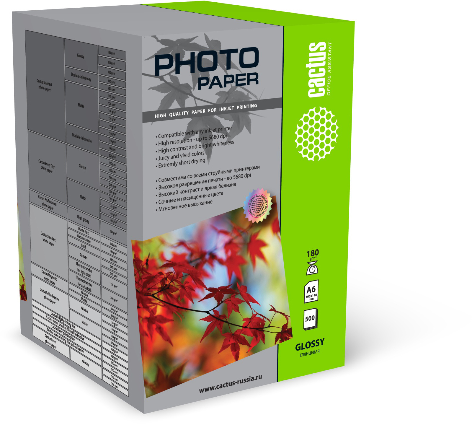 Глянцевая фотобумага Cactus отлично подходит для печати памятных фотографий в фото-рамку или фотоальбом. Обладая приятным глянцевым блеском, она украсит ваши фотографии и презентации. А высококлассное покрытие позволит добиться максимально точной цветопередачи, что будет полезно при печати макетов и web-графики.