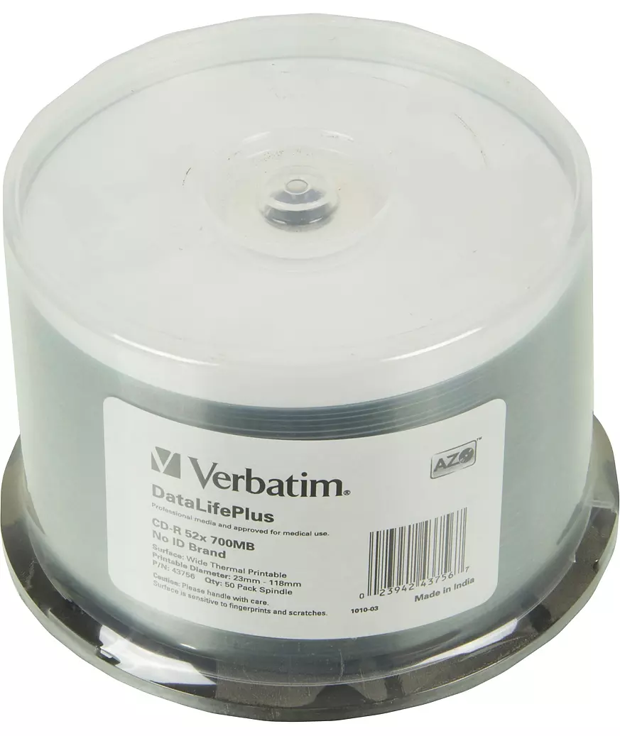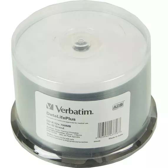 Диск CD-R Verbatim 700Mb 52x Cake Box Printable, 50шт или<уп.10 шт> на шпинделе [43756]