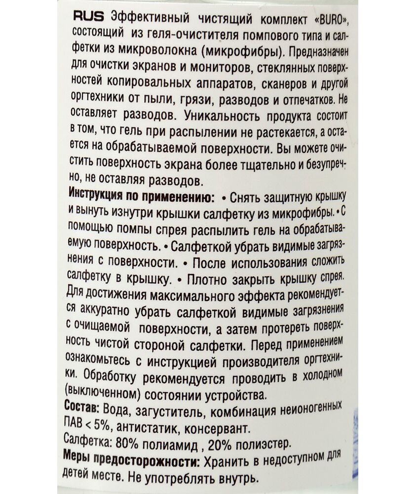Чистящий набор состоит из геля-очистителя и салфетки из микроволокна. Предназначен для очистки экранов и оптики от грязи, пыли и отпечатков пальцев. Не оставляет разводов, не содержит спирт.