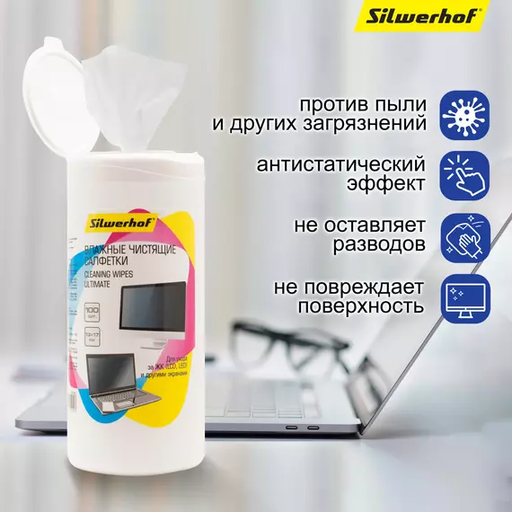 Салфетки Silwerhof Ultimate для экранов мониторов/плазменных/ЖК телевизоров/ноутбуков туба 100шт влажных