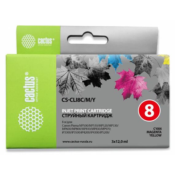 Картридж струйный набор Cactus CS-CLI8C/M/Y голубой/пурпурный/желтый 36мл для Canon MP470/500/530/600/ 800/810/830/970/ MX850/iP4200/4300/520 с чипом