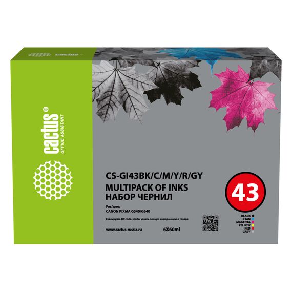 Чернила Cactus CS-GI43BK/C/M/Y/R/GY голубой/пурпурный/желтый/черный 6x60мл для Canon Pixma G640/G540