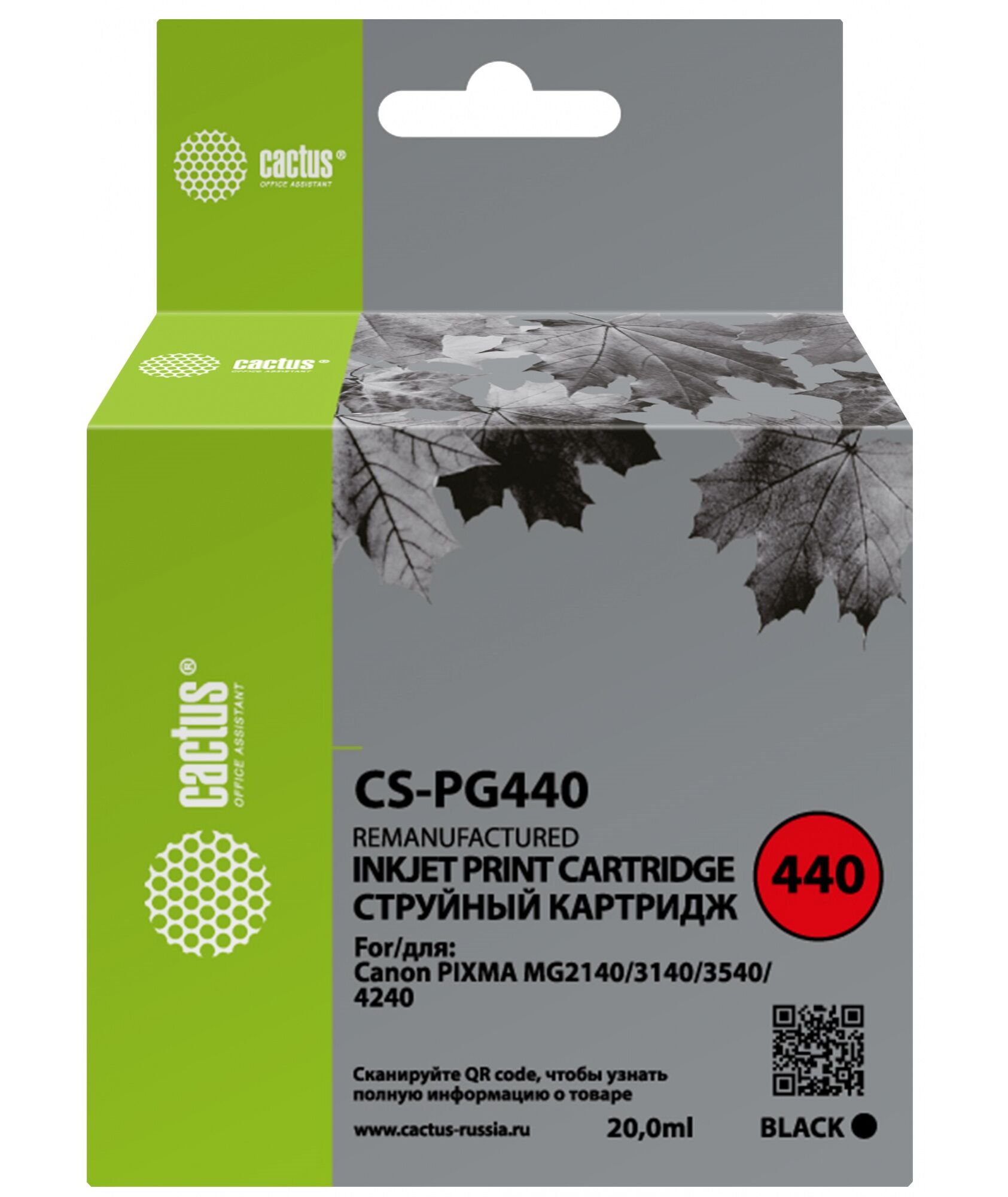 Картридж струйный Cactus CS-PG440 черный 180стр., для Canon Pixma MG2140/3140/2240/2245/3240/3540/ 3640/4140/4240/4250/MX374/375/394/ 434/454/474/514/524/534/TS5140 с чипом