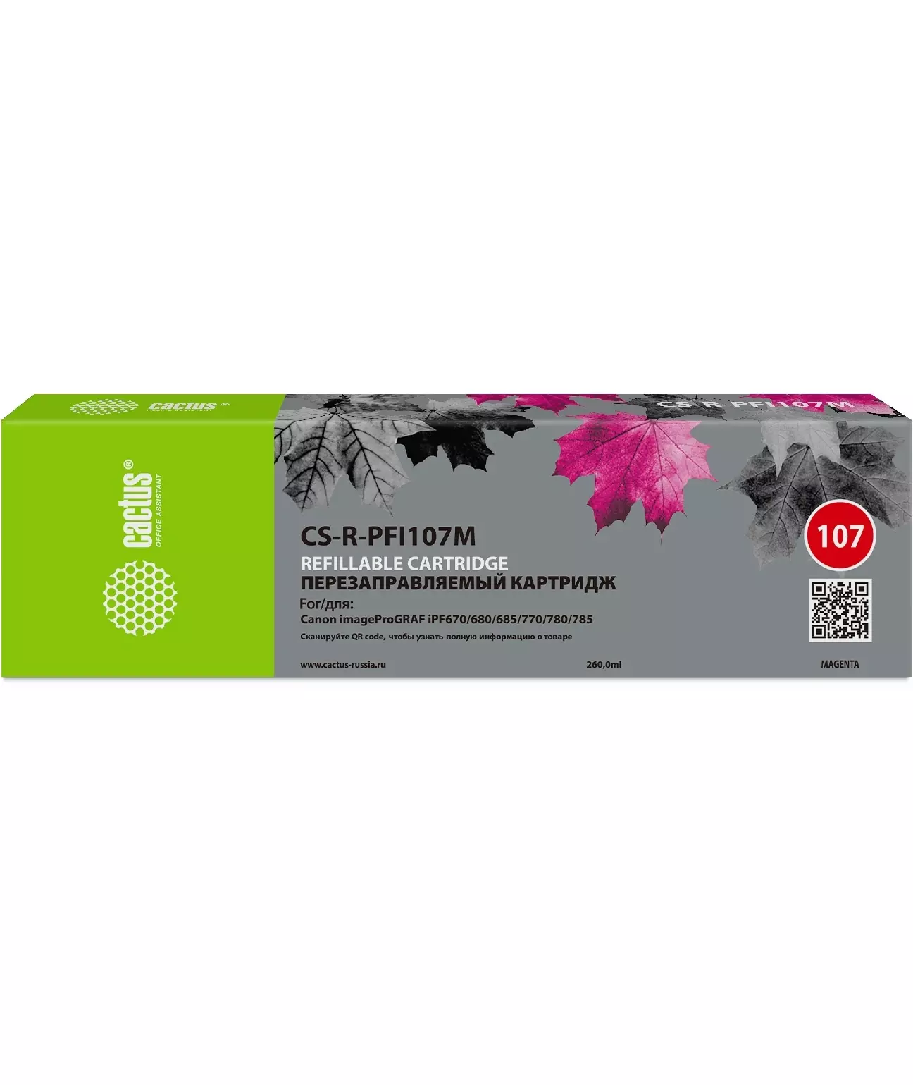 Картридж перезаправляемый струйный Cactus CS-R-PFI107M пурпурный, 260мл, перезаправляемый, без чипа, для Canon iPF670/680/685/770/780/785