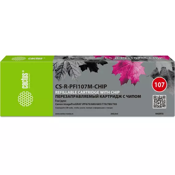 Картридж перезаправляемый Cactus CS-R-PFI107M-CHIP пурпурный, 260мл, перезаправляемый, струйный, с чипом, для Canon iPF670/680/685/770/780/785