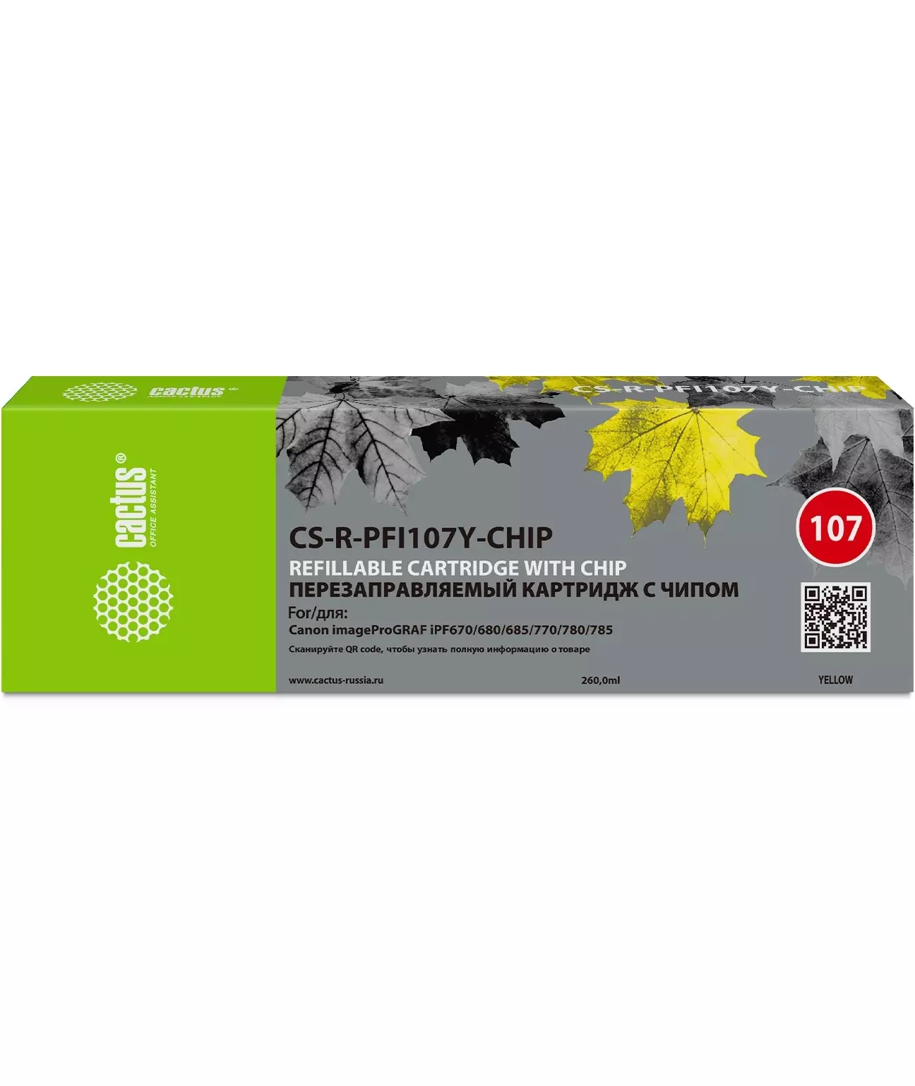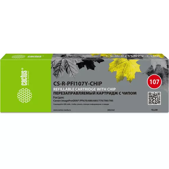 Картридж перезаправляемый Cactus CS-R-PFI107Y-CHIP струйный желтый 260мл для Canon imageProGRAF iPF670/680/685/770/780/785 с чипом