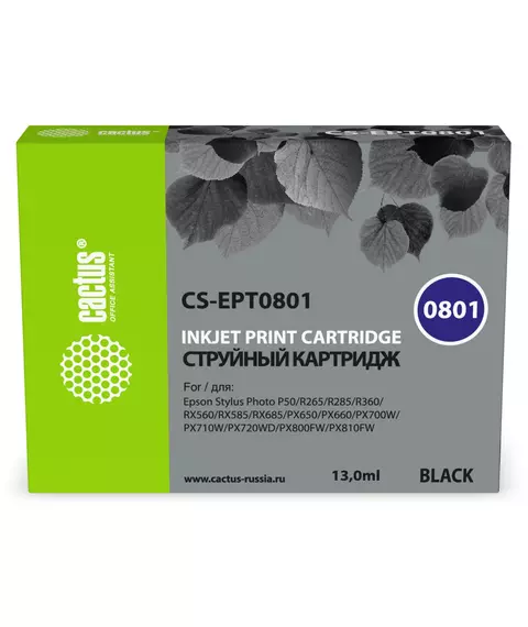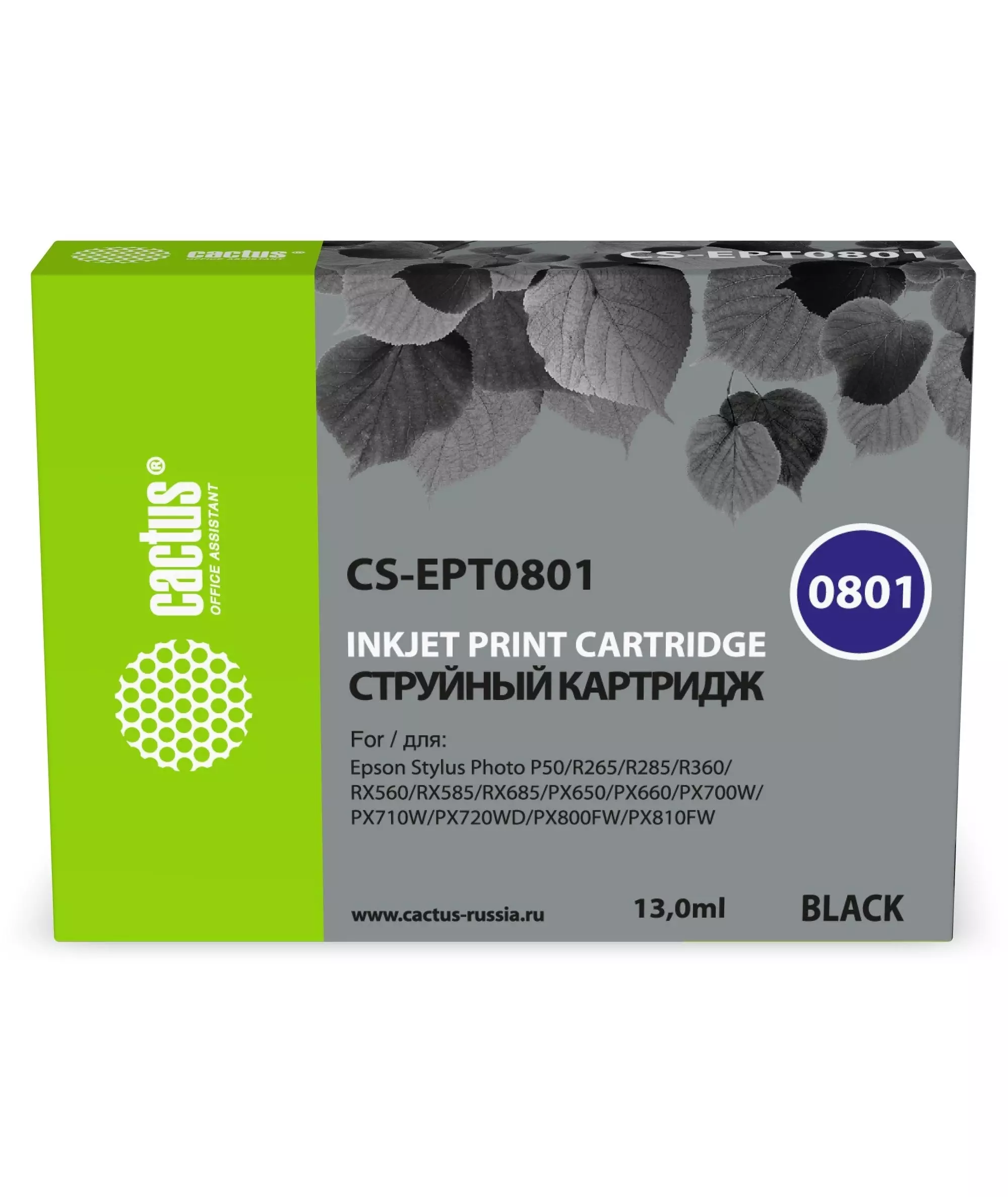 Картридж струйный Cactus CS-EPT0801 черный (13.0мл) для Epson Stylus PhotoP50/PX650/PX660/PX700/PX700W/ PX710/PX710W/PX720/PX720WD/PX800/ PX800FW/PX810/PX810FW/PX820/PX820FWD/ R265/R285/R360/RX560/RX585/RX685 с чипом