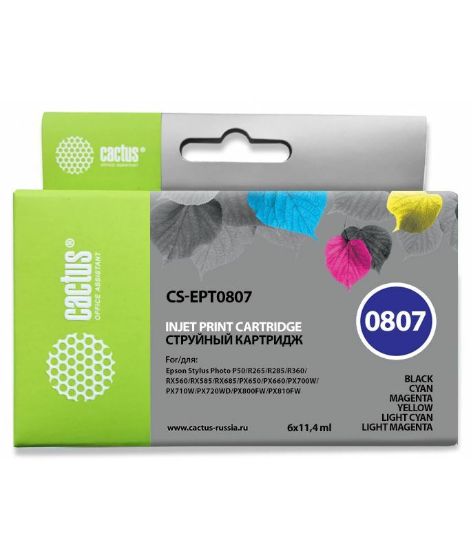 Картридж струйный Cactus CS-EPT0807 черный/желтый/голубой/пурпурный/светло-голубой/светло-пурпурный набор (68.4мл) для Epson St Ph P50 с чипом