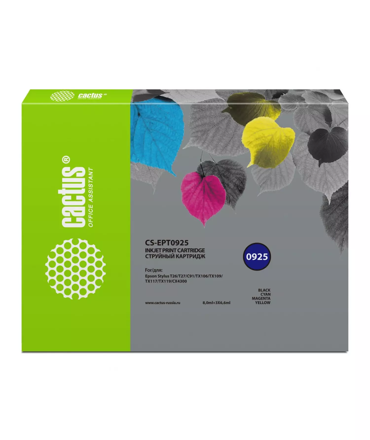 Картридж струйный Cactus CS-EPT0925 черный/голубой/пурпурный/желтый набор (27.8мл) для Epson Stylus C91/CX4300/T26/T27/TX106/TX109/TX117/TX119 с чипом