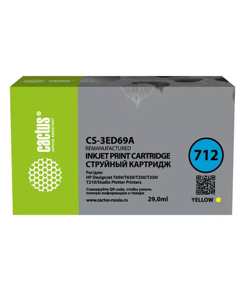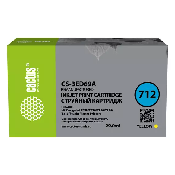 Картридж струйный Cactus CS-3ED69A 712 желтый (29мл) для HP DJ T230/T630/T650 с чипом