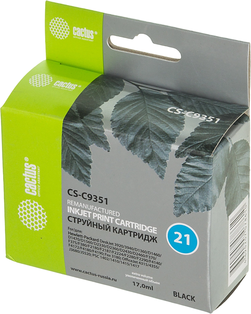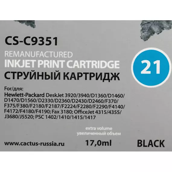 Картридж струйный Cactus CS-C9351 №21 черный 17мл для DJ 3920/3940/D1360/D1460/D1470/D1560/D2330/D2360/D2430/D2460/F370/F375/F380/F2180/F2187/F2224/F2280/F2290/F4140/F4172/F4180/F4190 с чипом [CS-C9351]