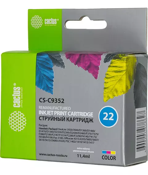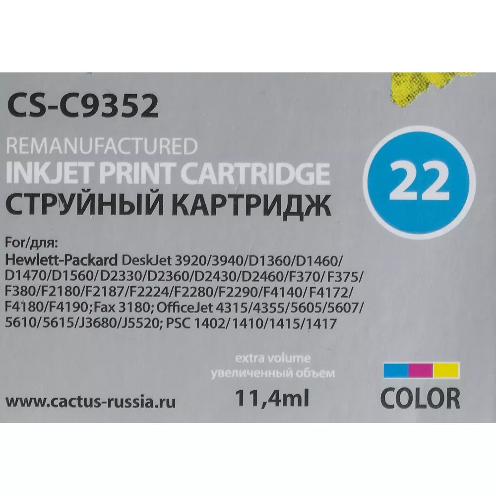 Картридж струйный Cactus CS-C9352 №22 многоцветный 11.4мл для DJ 3920/3940/D1360/D1460/D1470/D1560/D2330/D2360/D2430/D2460/F370/F375/F380/F2180/F2187/F2224/F2280/F2290/F4140/F4172/F4180/F4190 с чипом