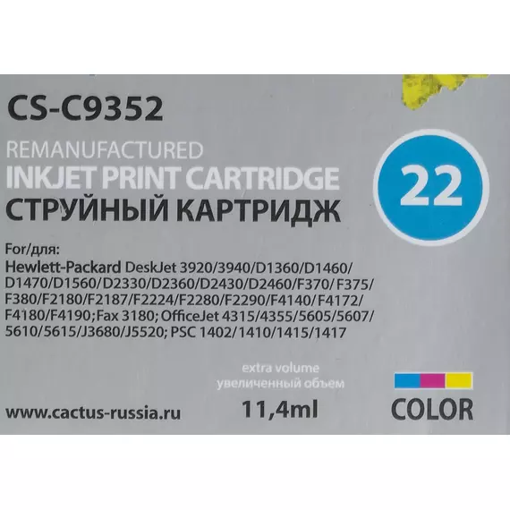 Картридж струйный Cactus CS-C9352 №22 многоцветный 11.4мл для DJ 3920/3940/D1360/D1460/D1470/D1560/D2330/D2360/D2430/D2460/F370/F375/F380/F2180/F2187/F2224/F2280/F2290/F4140/F4172/F4180/F4190 с чипом [CS-C9352]