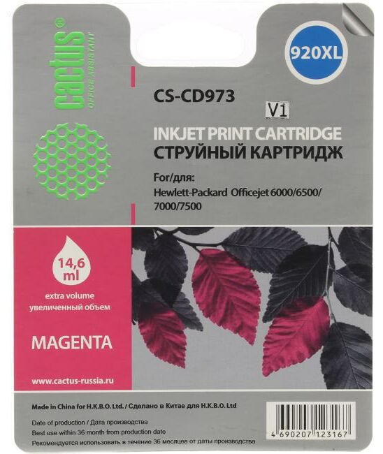 Картридж Cactus CS-CD973 №920XL, пурпурный, для HP OfficeJet 6000/6500/7000/7500