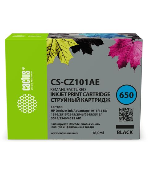 Картридж струйный Cactus CS-CZ101AE № 650 черный (18мл) для HP 1015/1515/1516/2515/2545/ 2546/2645/3515/3545/3546/4515