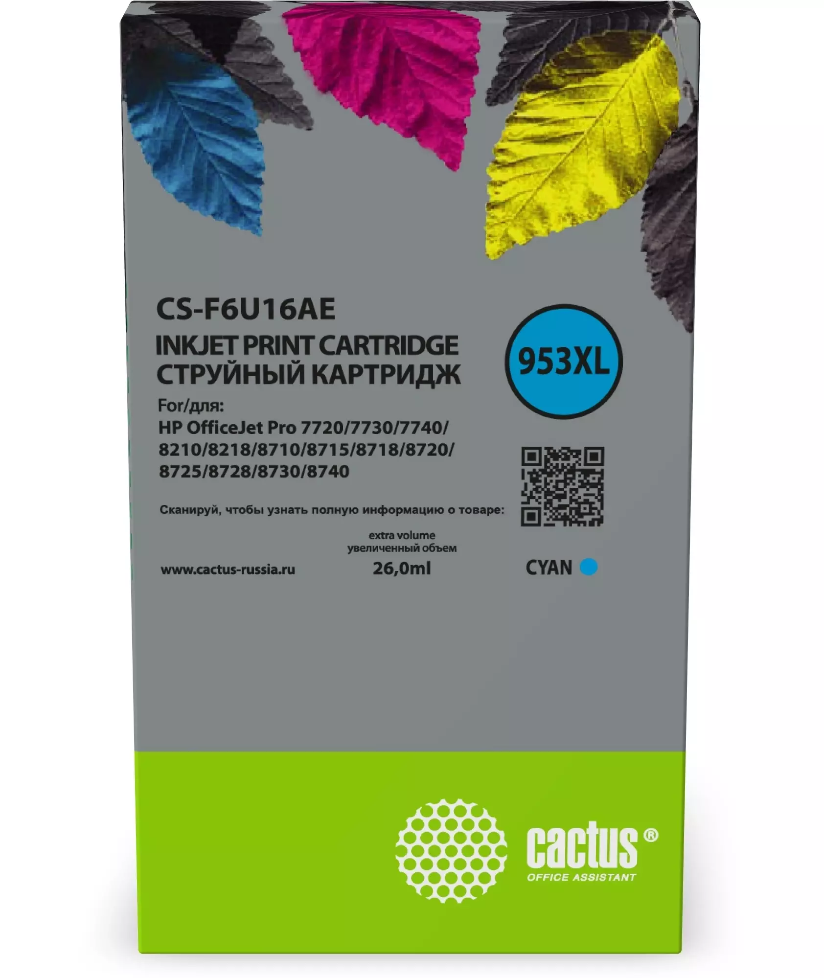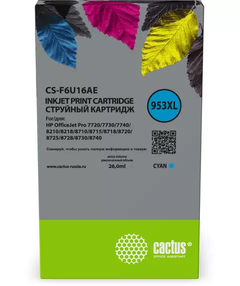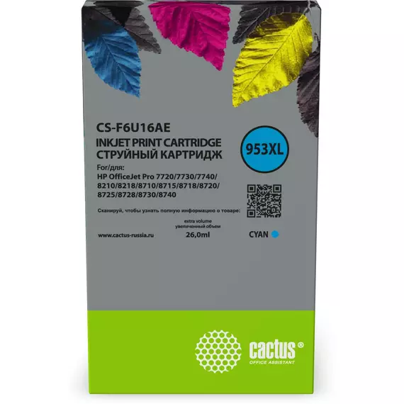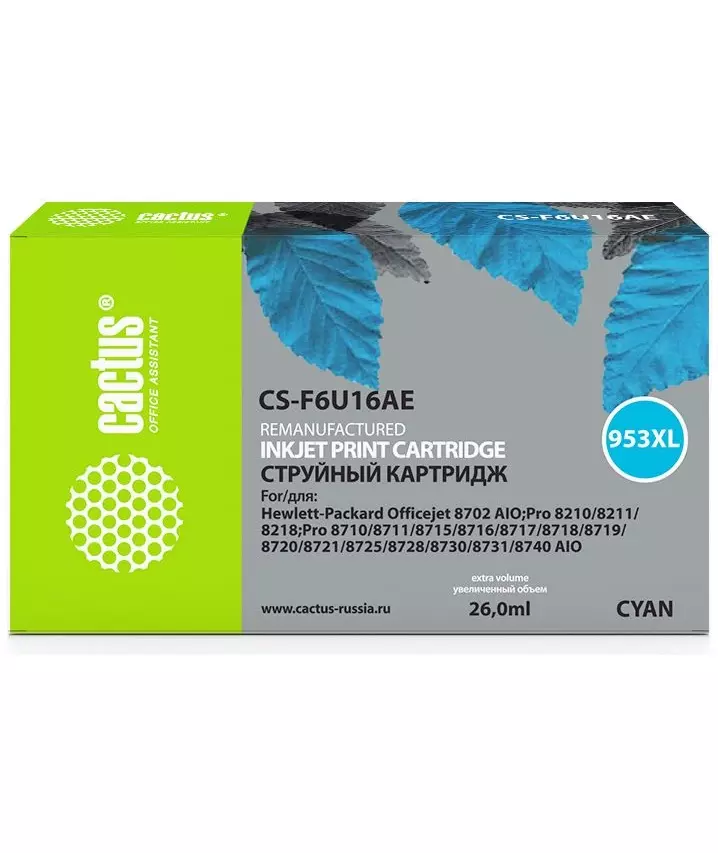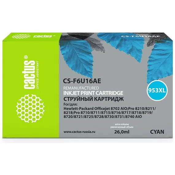 Картридж струйный Cactus CS-F6U16AE 953XL голубой 26мл для HP OJ Pro 7740/8210/8218/8710/8715 с чипом [CS-F6U16AE]