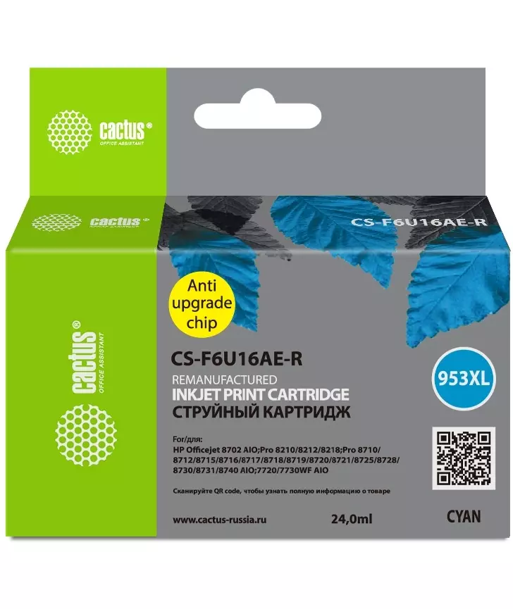 Картридж струйный Cactus CS-F6U16AE-R 953XL голубой 24мл для HP OJ Pro 7740/8210/8218/8710/8715 с чипом