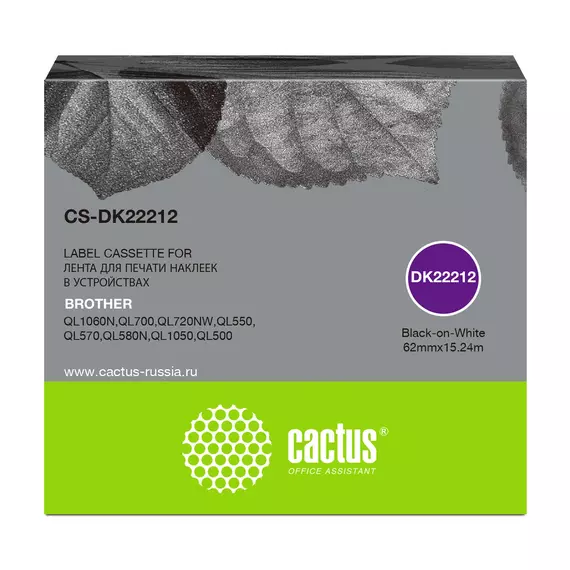 Картридж ленточный Cactus CS-DK22212 черный на белом 62x15.24 для P-touch QL-500, QL-550, QL-700, QL-800