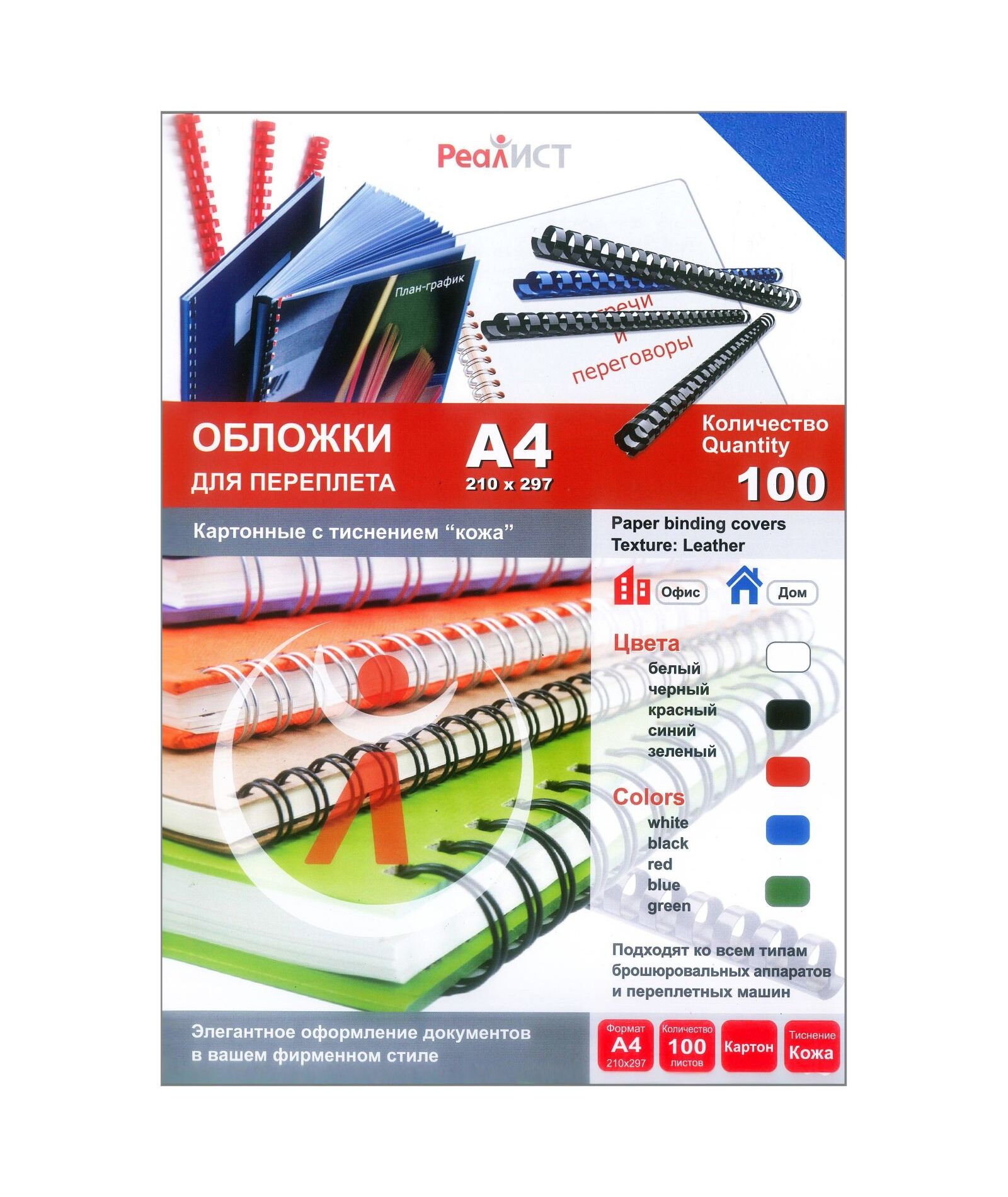 Обложка для переплета картонная используется при брошюровке документов чаще всего как нижняя обложка. Картонная обложка для переплета хорошо защищает страницы бумаги от пыли и грязи, придает документу более строгий и презентабельный вид. Поверхность обложки имитирует текстуру кожи , обложка шероховатая и приятная на ощупь, ее удобно держать в руках. Цвет обложки: Синий. Обложка жесткая, ее плотность от 200 до 220 г/м2. Формат обложек А4. В одной упаковке 100 штук обложек. Подходит ко всем типам брошюраторов и переплетных машин.