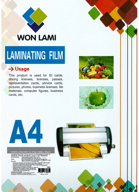 Пленка для ламинирования 216х303 А4, 100мкм, 100 шт, WF