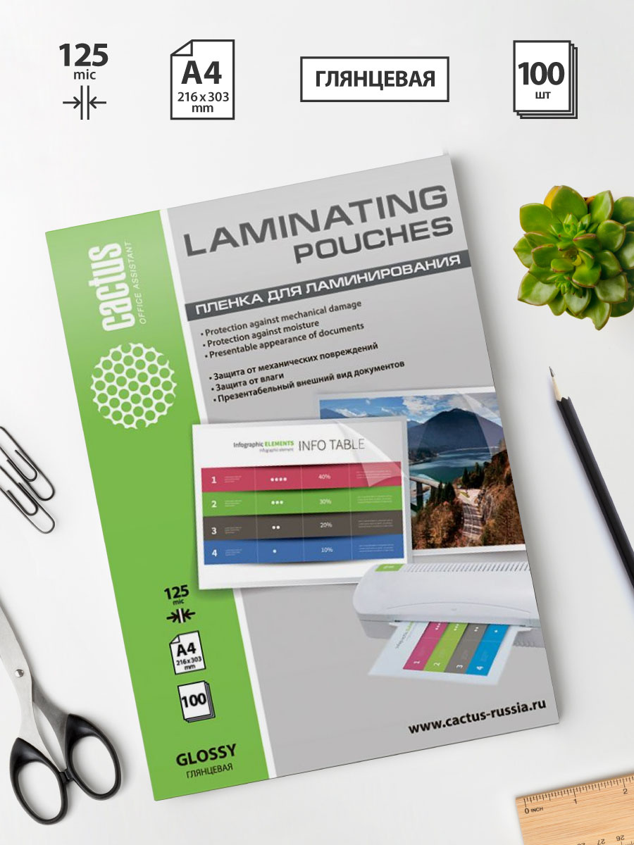 Пленка для ламинирования Cactus CS-LPGA4125100 125мкм A4 216x303мм глянцевая 100шт