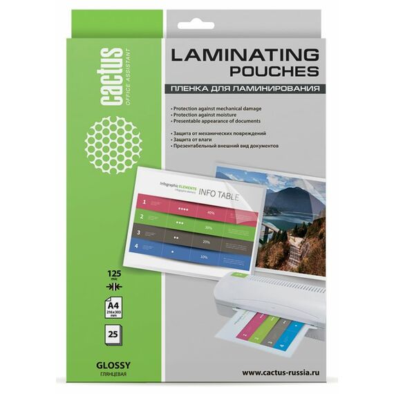 Пленка для ламинирования Cactus CS-LPGA412525 125мкм, A4, 25шт, глянцевая, 216x303мм