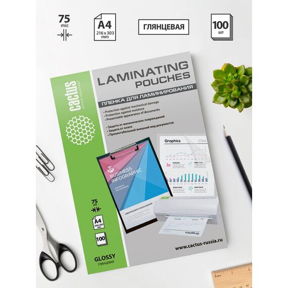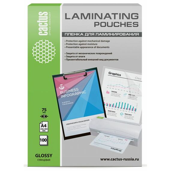 Пленка для ламинирования Cactus CS-LPGA475100 75мкм, А4, 216x303мм, глянцевая, 100шт