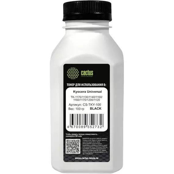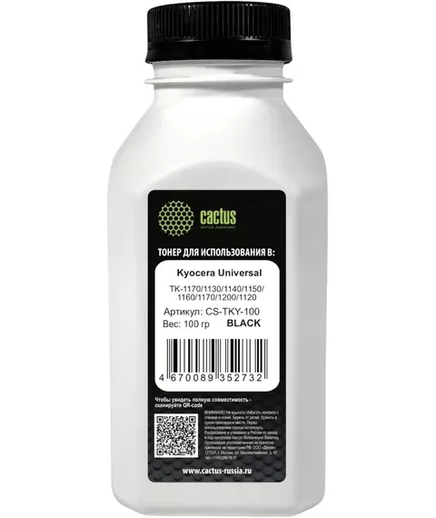 Тонер Cactus CS-TKY-100 черный флакон 100гр. для принтера Universal TK-1170/1130/1140/1150/1160/1170/1200/1120, FS-720/1000/1028/1016/1030/1035/1050/1018/1118/ 1120/1128/1130/1135/1300/1320/1350/1370/2000/3900/ 4000/2020/2100/4020/3920/3040/3140/ 3540/3640/4100/4200/4300/6025/6525/6525/6530
